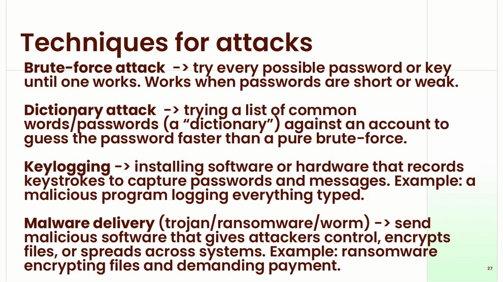 Techniques for attacksBrute-force attack -> try every possible password or key