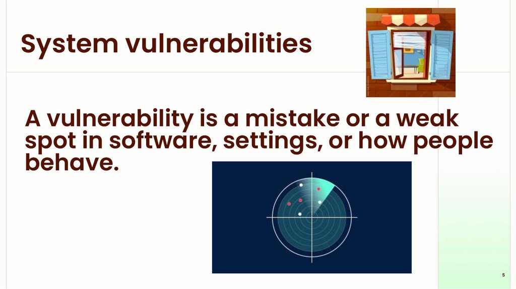 System vulnerabilitiesA vulnerability is a mistake or a weak