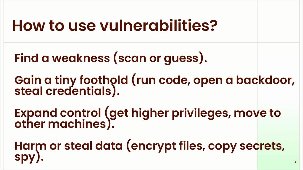 How to use vulnerabilities?Find a weakness (scan or guess).