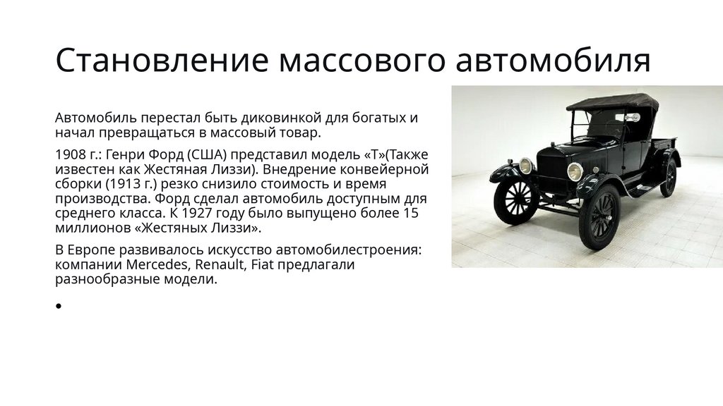 Становление массового автомобиляАвтомобиль перестал быть диковинкой для богатых и