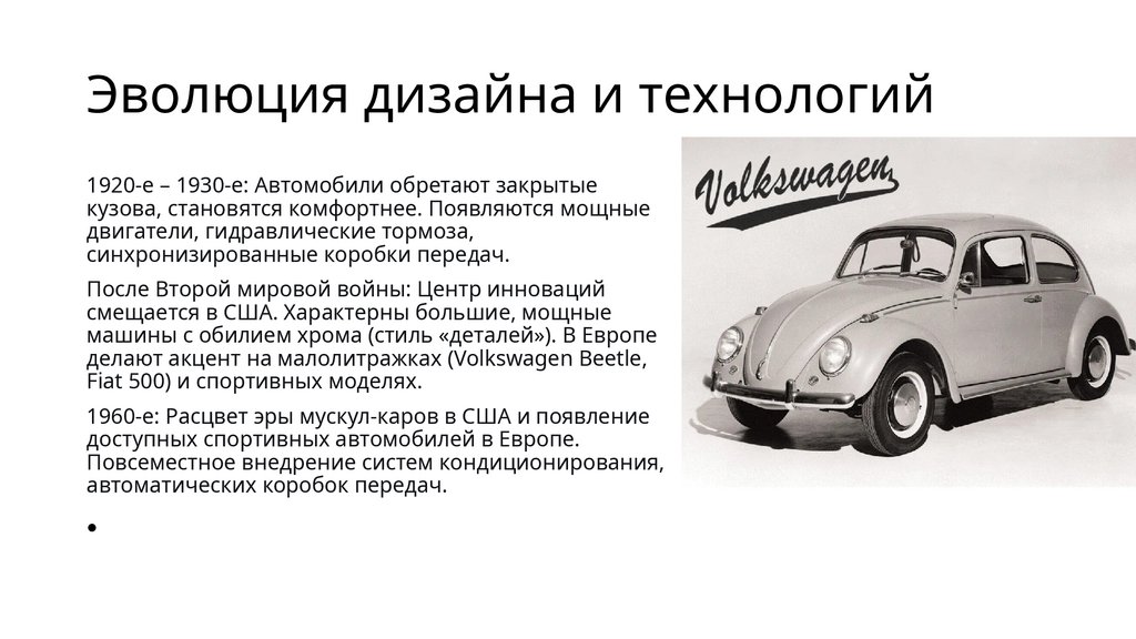 Эволюция дизайна и технологий1920-е – 1930-е: Автомобили обретают закрытые