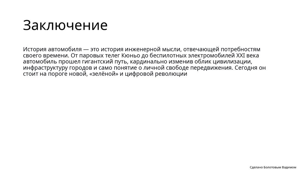 ЗаключениеИстория автомобиля — это история инженерной мысли, отвечающей потребностям