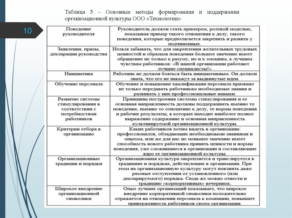 Таблица 5 – Основные методы формирования и поддержанияорганизационной культуры ООО «Технологии»
