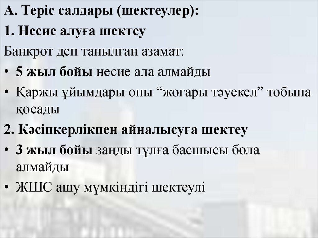 А. Теріс салдары (шектеулер):1. Несие алуға шектеу