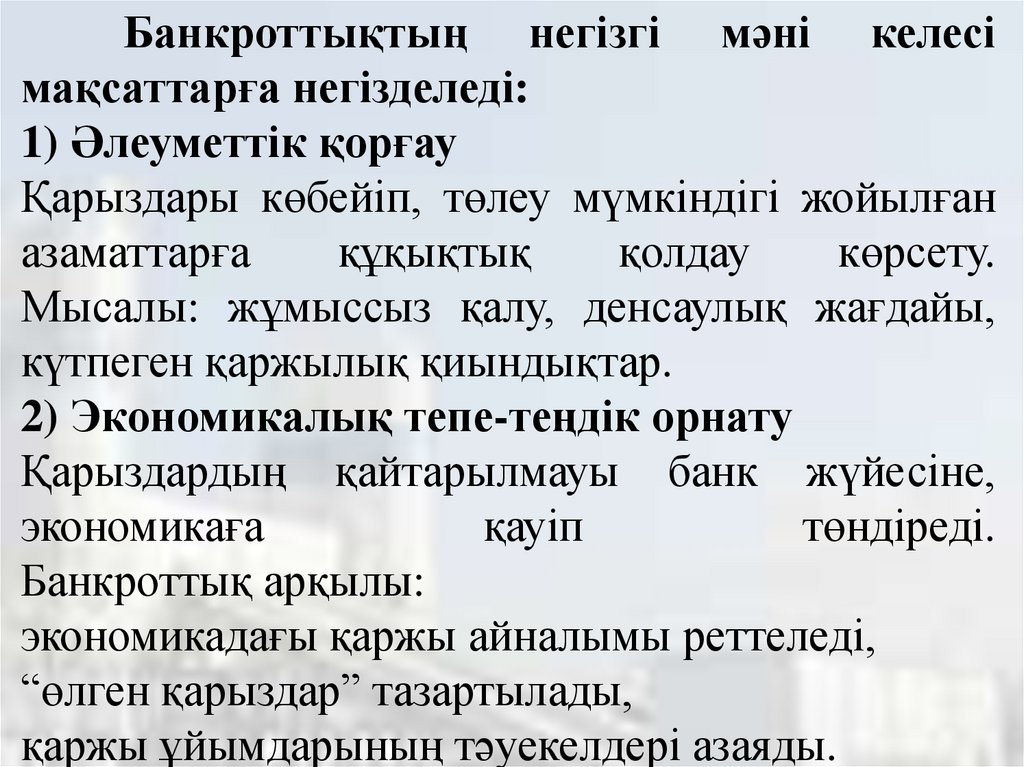 Банкроттықтың негізгі мәні келесімақсаттарға негізделеді: