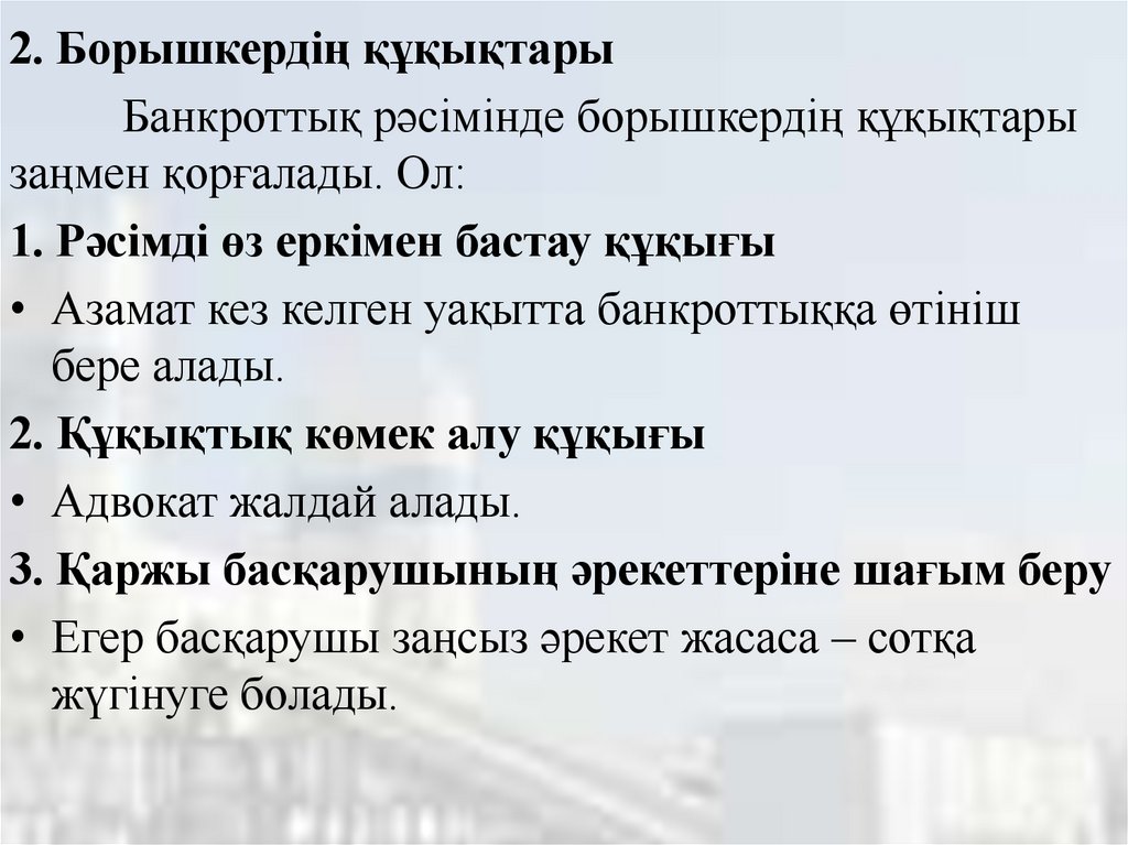 2. Борышкердің құқықтарыБанкроттық рәсімінде борышкердің құқықтары