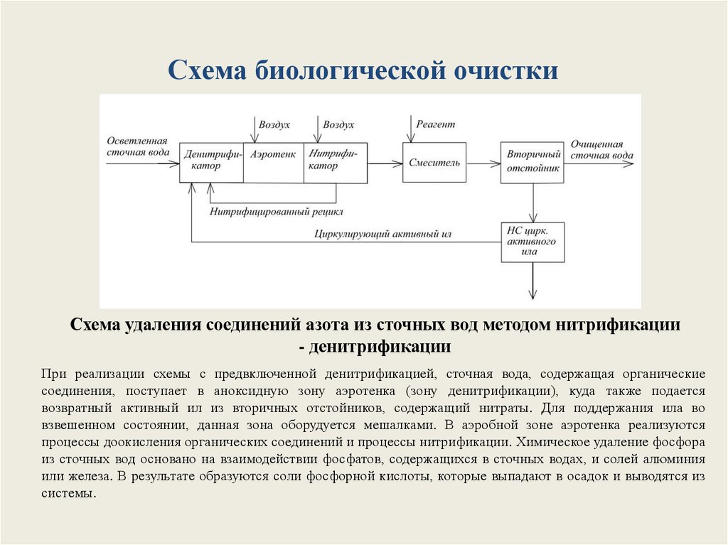 Схема биологической очисткиСхема удаления соединений азота из сточных вод методом нитрификации