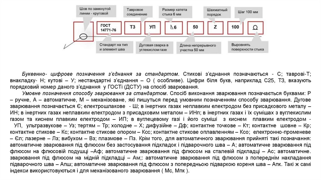 газом та киснем плавким електродом – ИП; в вуглецевому газі і його суміші з киснем плавким електродом УП, ультразвукове – Уз; тертям – Тр; холодне – Х; дифузійне – Дф; контактне точкове – Кт; контактне шовне – Кр;