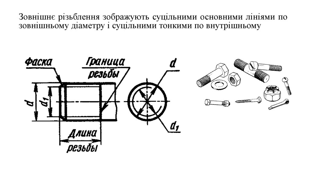 Зовнішнє різьблення зображують суцільними основними лініями позовнішньому діаметру і суцільними тонкими по внутрішньому