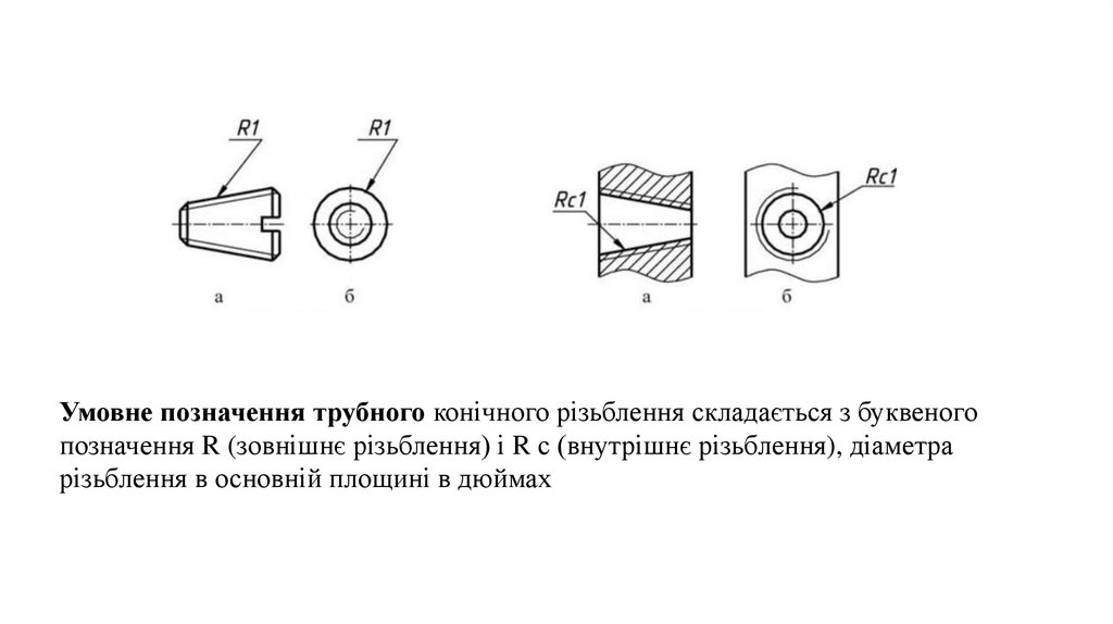 Умовне позначення трубного конічного різьблення складається з буквеногопозначення R (зовнішнє різьблення) і R с (внутрішнє різьблення), діаметра