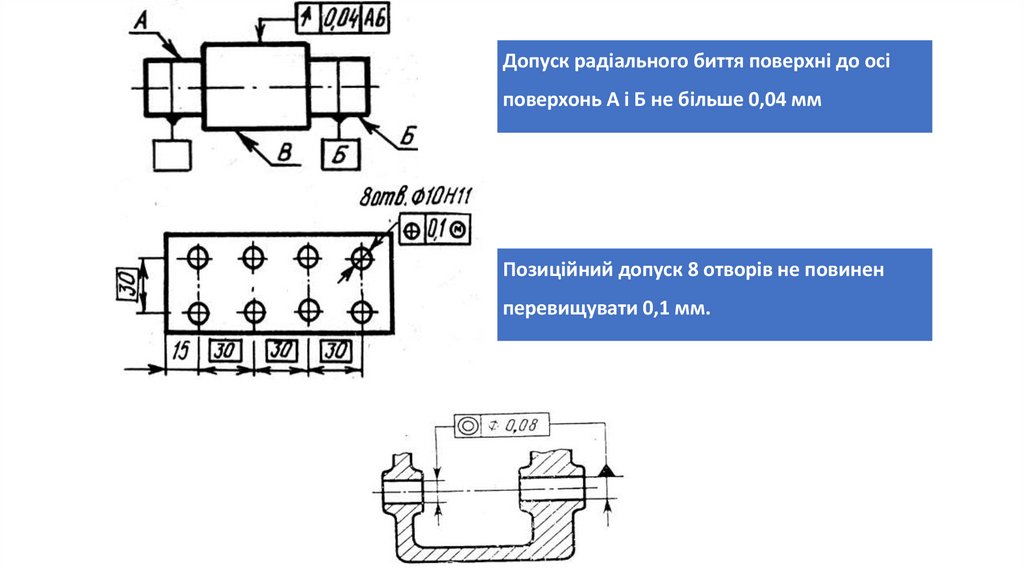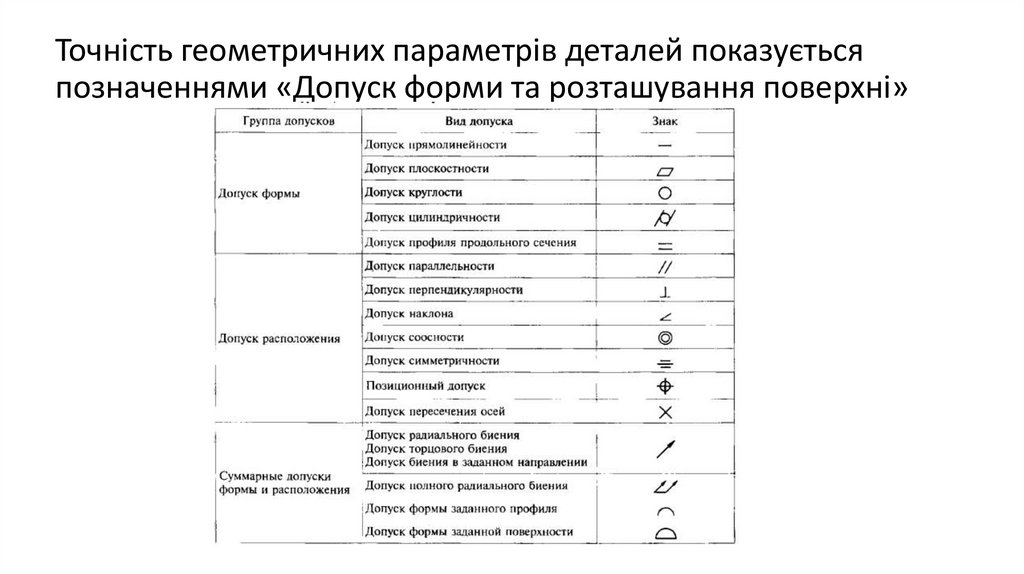 Точність геометричних параметрів деталей показуєтьсяпозначеннями «Допуск форми та розташування поверхні»