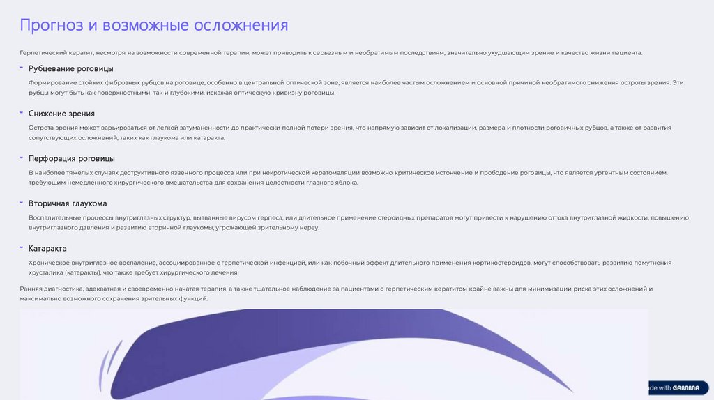 Ранняя диагностика, адекватная и своевременно начатая терапия, а также тщательное наблюдение за пациентами с герпетическим кератитом крайне важны для минимизации риска этих осложнений и