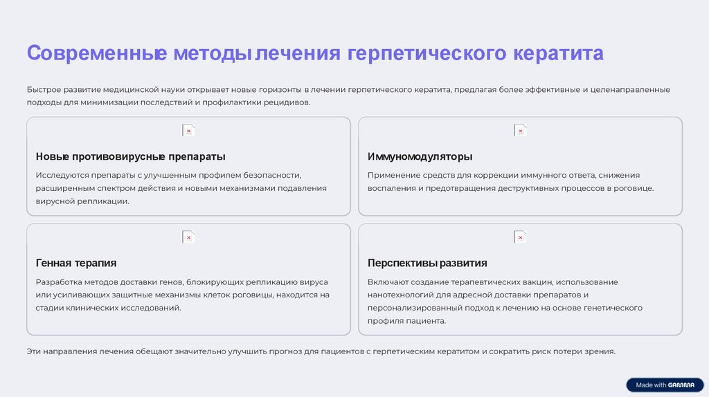Современные методы лечения герпетического кератитаБыстрое развитие медицинской науки открывает новые горизонты в лечении герпетического кератита, предлагая более эффективные и целенаправленные