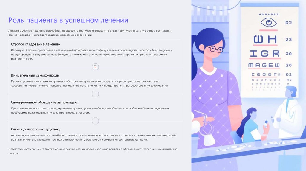 Роль пациента в успешном леченииАктивное участие пациента в лечебном процессе герпетического кератита играет критически важную роль в достижении