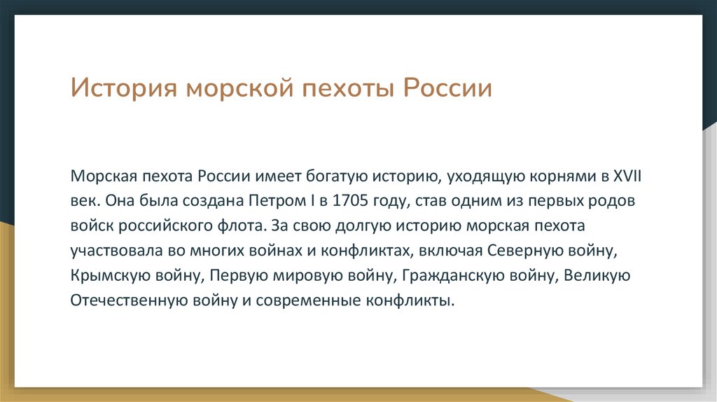 История морской пехоты РоссииМорская пехота России имеет богатую историю, уходящую корнями в XVII