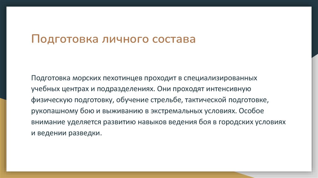 Подготовка личного составаПодготовка морских пехотинцев проходит в специализированных