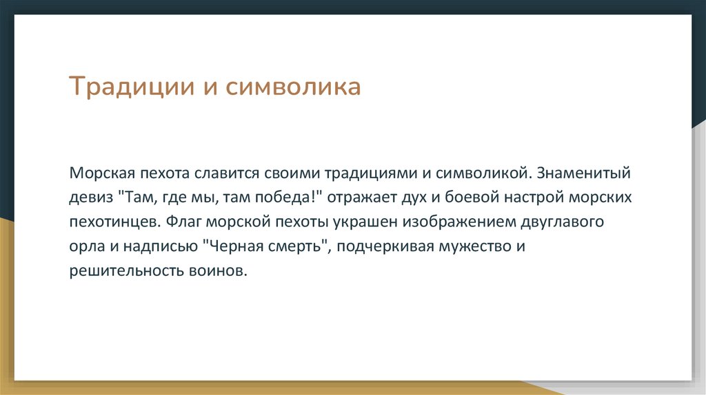 Традиции и символикаМорская пехота славится своими традициями и символикой. Знаменитый