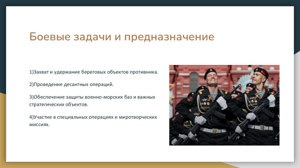 Боевые задачи и предназначение1)Захват и удержание береговых объектов противника.
