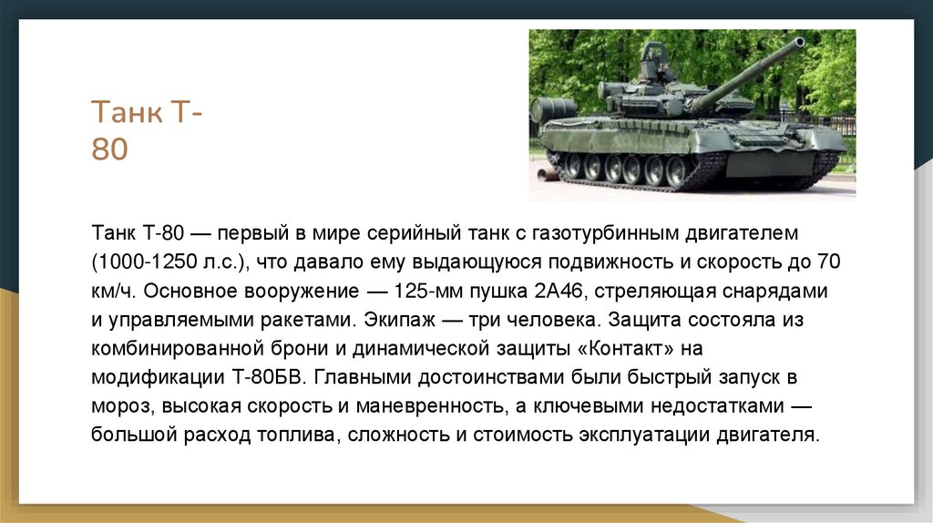 Танк Т80Танк Т-80 — первый в мире серийный танк с газотурбинным двигателем