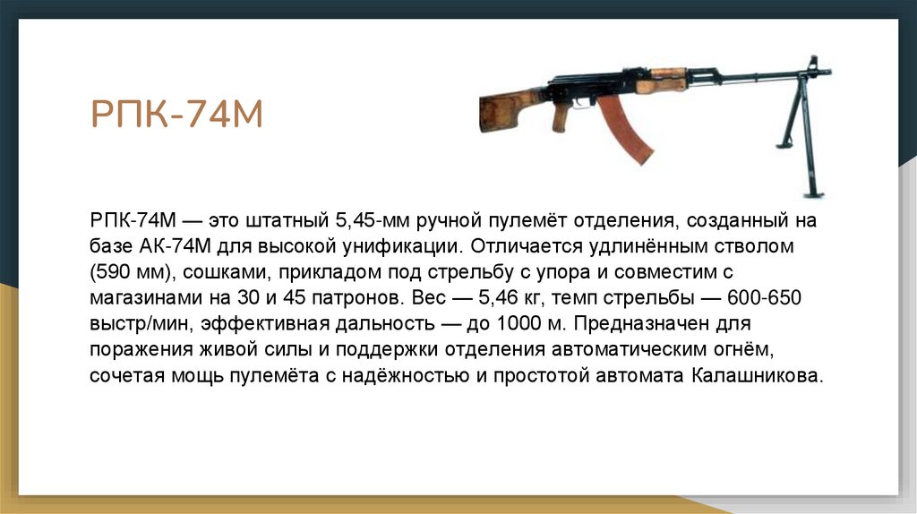 РПК-74МРПК-74М — это штатный 5,45-мм ручной пулемёт отделения, созданный на