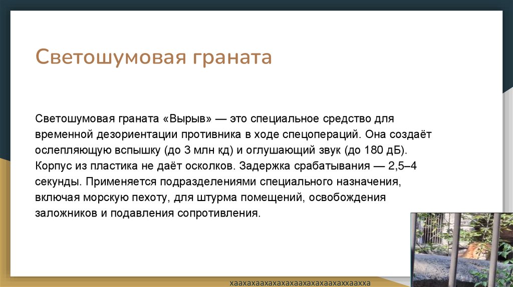 ослепляющую вспышку (до 3 млн кд) и оглушающий звук (до 180 дБ).