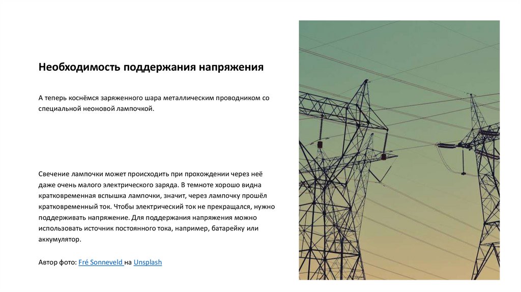 Необходимость поддержания напряженияА теперь коснёмся заряженного шара металлическим проводником со