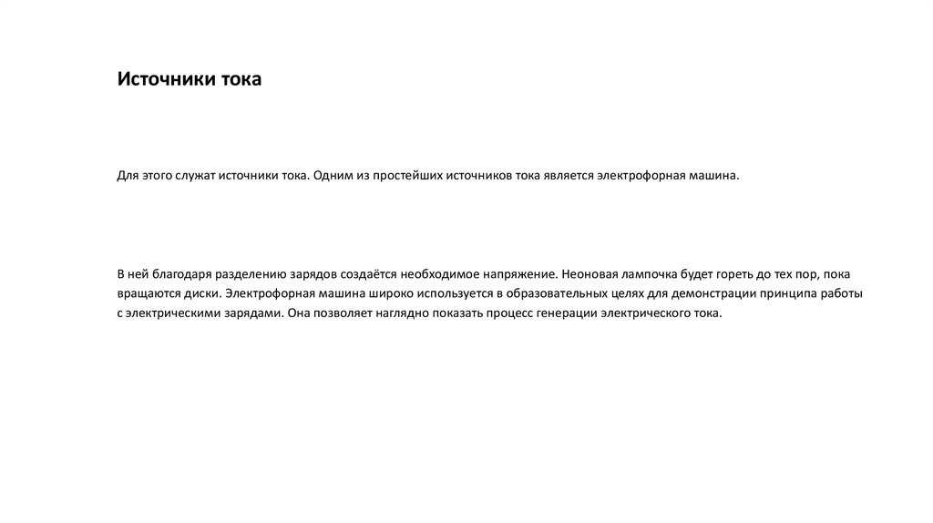 Источники токаДля этого служат источники тока. Одним из простейших источников тока является электрофорная машина.