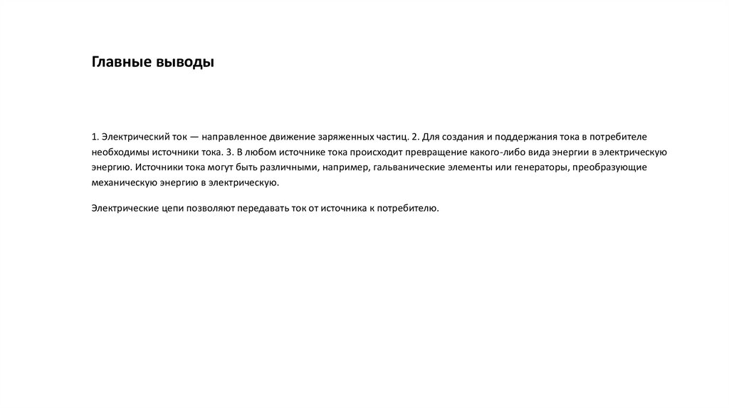 Главные выводы1. Электрический ток — направленное движение заряженных частиц. 2. Для создания и поддержания тока в потребителе