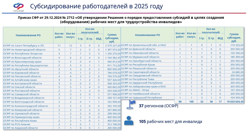 Субсидирование работодателей в 2025 годуПриказ СФР от 29.12.2024 № 2712 «Об утверждении Решения о порядке предоставления субсидий в целях создания
