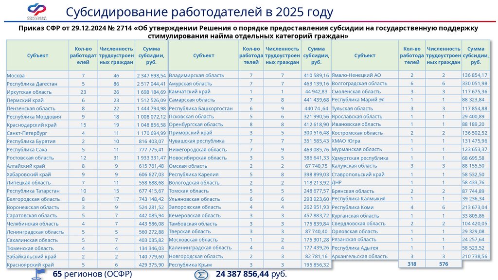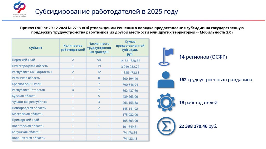 Субсидирование работодателей в 2025 годуПриказ СФР от 29.12.2024 № 2713 «Об утверждении Решения о порядке предоставления субсидии на государственную