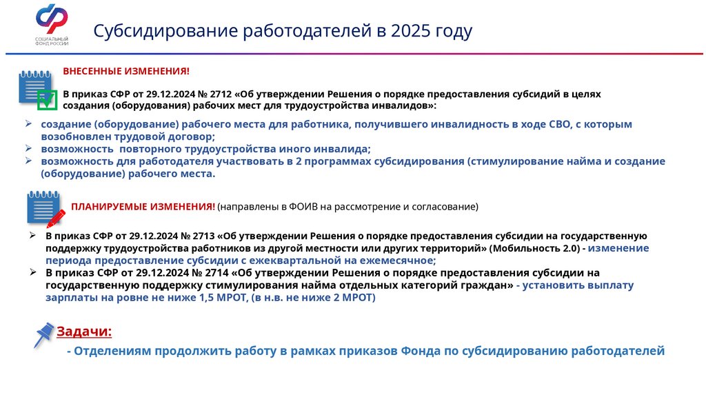 - Отделениям продолжить работу в рамках приказов Фонда по субсидированию работодателей