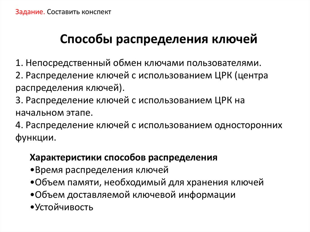Задание. Составить конспектСпособы распределения ключей