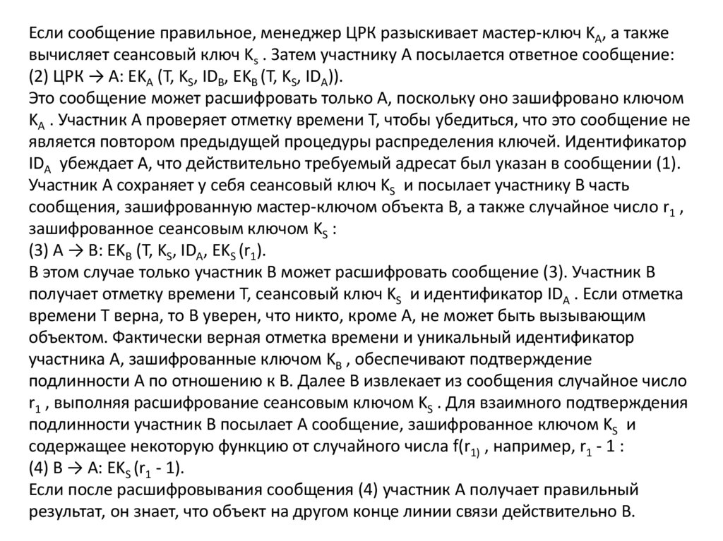 Если сообщение правильное, менеджер ЦРК разыскивает мастер-ключ KA, а такжевычисляет сеансовый ключ Ks . Затем участнику А посылается ответное сообщение: