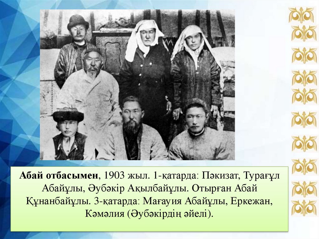 Абай отбасымен, 1903 жыл. 1-қатарда: Пәкизат, ТурағұлАбайұлы, Әубәкір Ақылбайұлы. Отырған Абай
