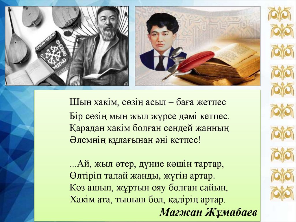 Шын хакім, сөзің асыл – баға жетпесБір сөзің мың жыл жүрсе дәмі кетпес.