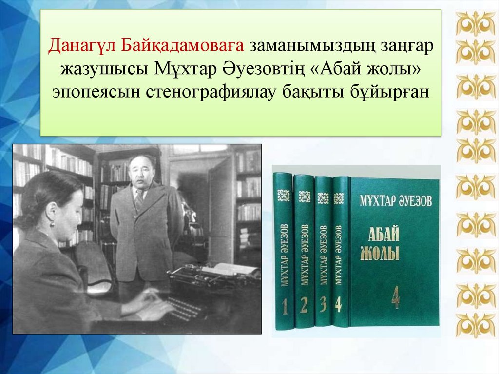 Данагүл Байқадамоваға заманымыздың заңғаржазушысы Мұхтар Әуезовтің «Абай жолы»