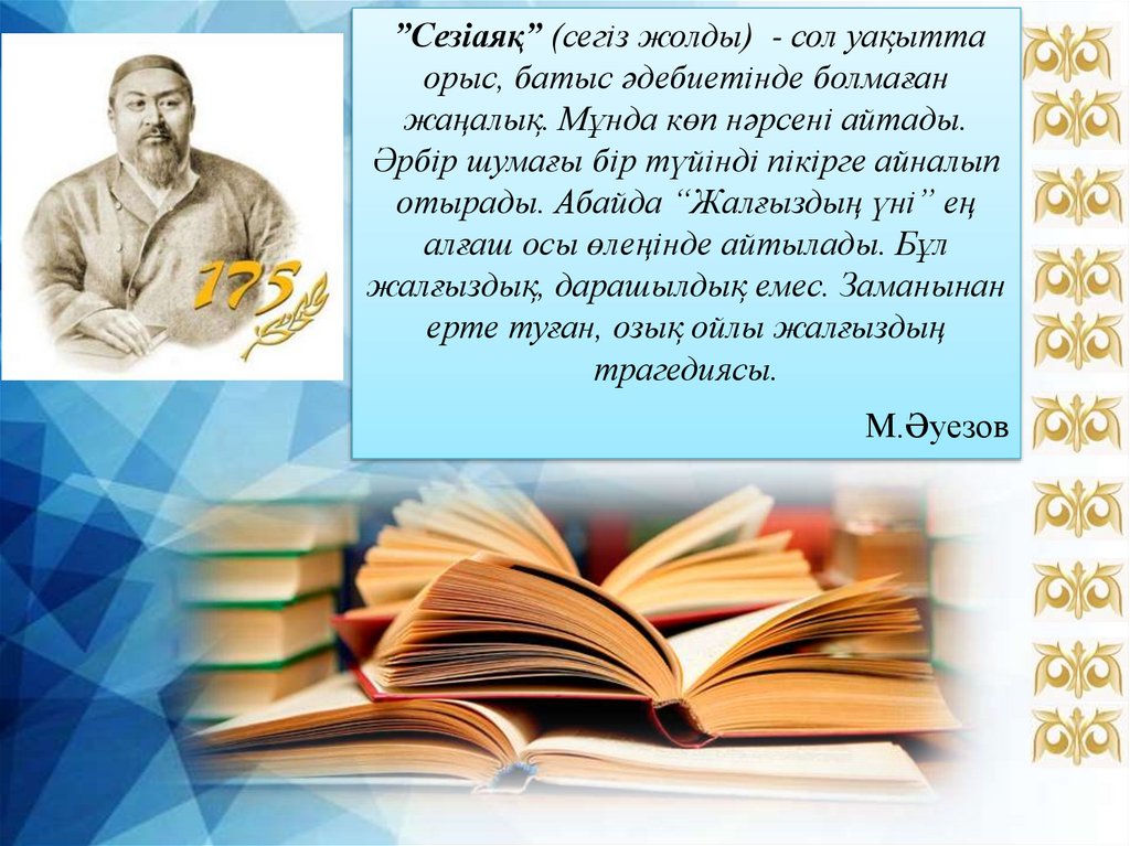”Сезіаяқ” (сегіз жолды) - сол уақыттаорыс, батыс әдебиетінде болмаған