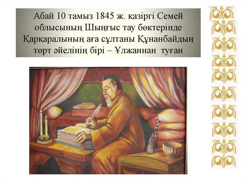 Абай 10 тамыз 1845 ж. қазіргі Семейоблысының Шыңғыс тау бөктерінде