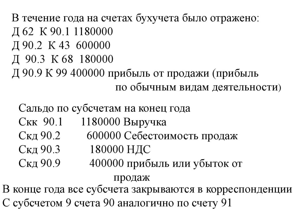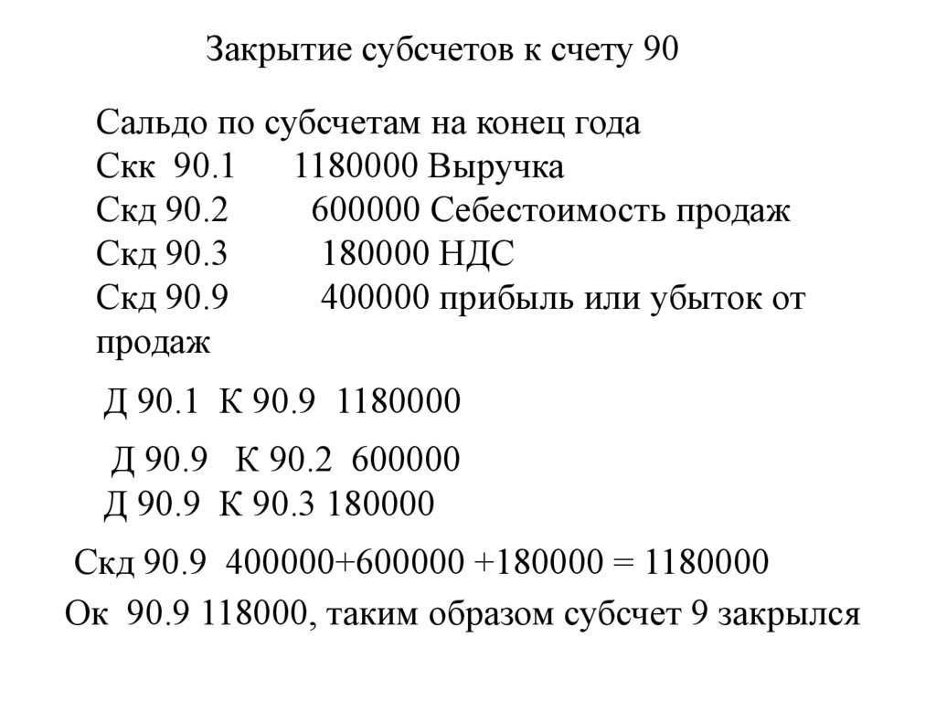 Закрытие субсчетов к счету 90Сальдо по субсчетам на конец года