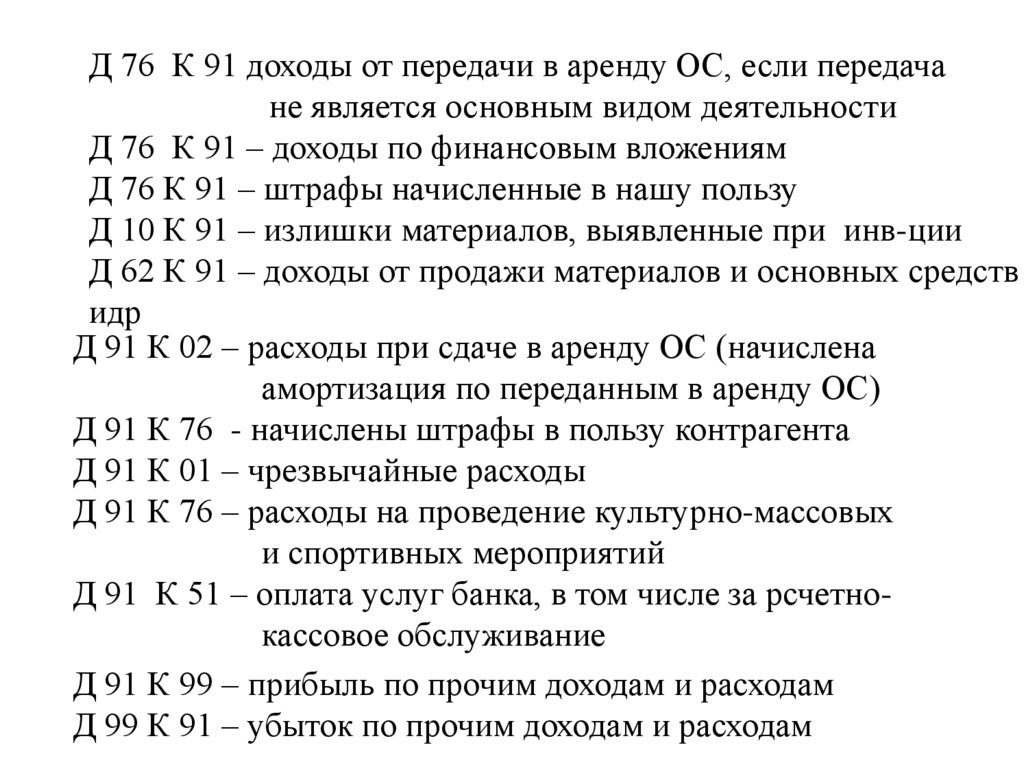 Д 76 К 91 доходы от передачи в аренду ОС, если передачане является основным видом деятельности