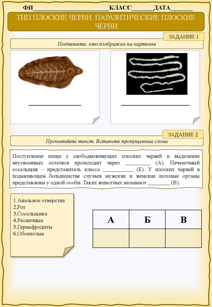 ФИ________________________КЛАСС_______ДАТА_______ТИП ПЛОСКИЕ ЧЕРВИ. ПАРАЗИТИЧЕСКИЕ ПЛОСКИЕ