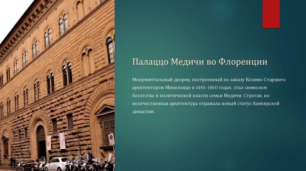 Палаццо Медичи во ФлоренцииМонументальный дворец, построенный по заказу Козимо Старшего