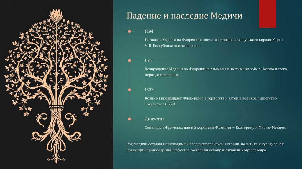 Род Медичи оставил неизгладимый след в европейской истории, политике и культуре. Их
