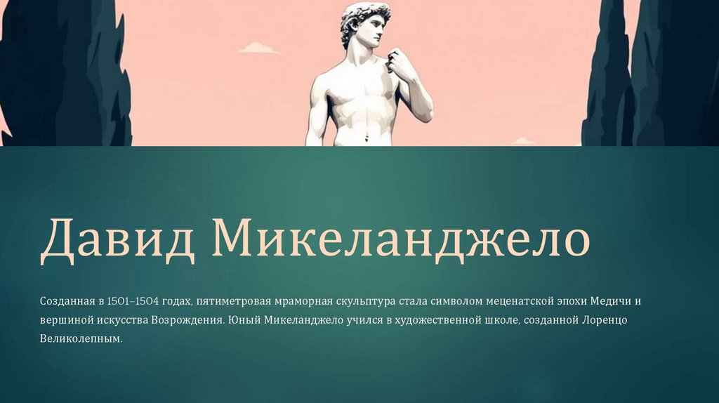 вершиной искусства Возрождения. Юный Микеланджело учился в художественной школе, созданной Лоренцо