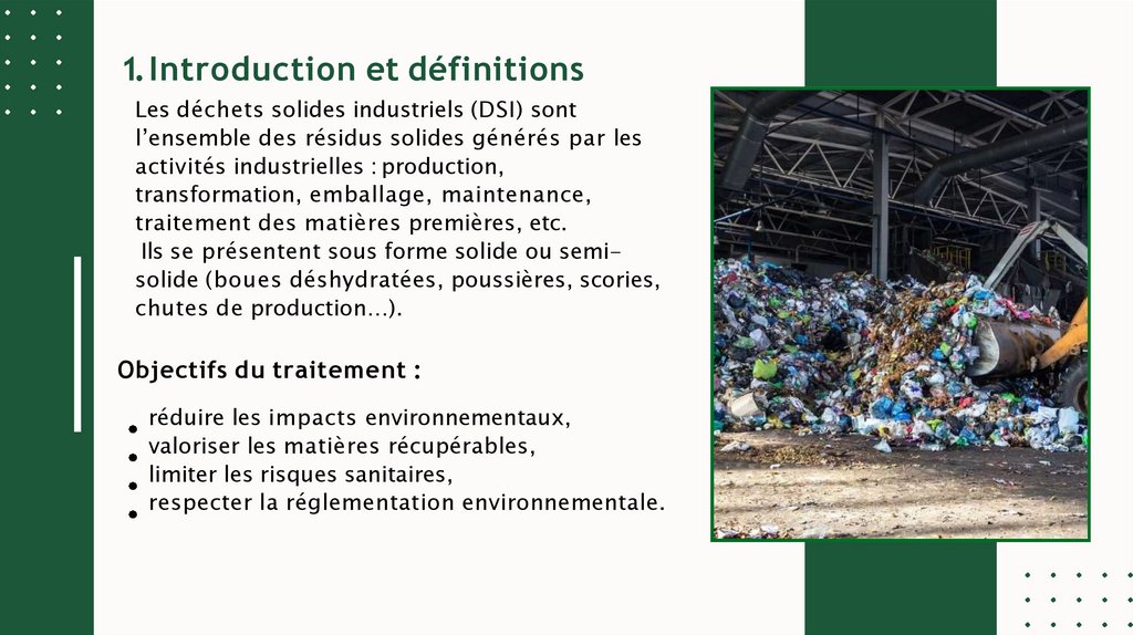 1.Introduction et définitionsLes déchets solides industriels (DSI) sont