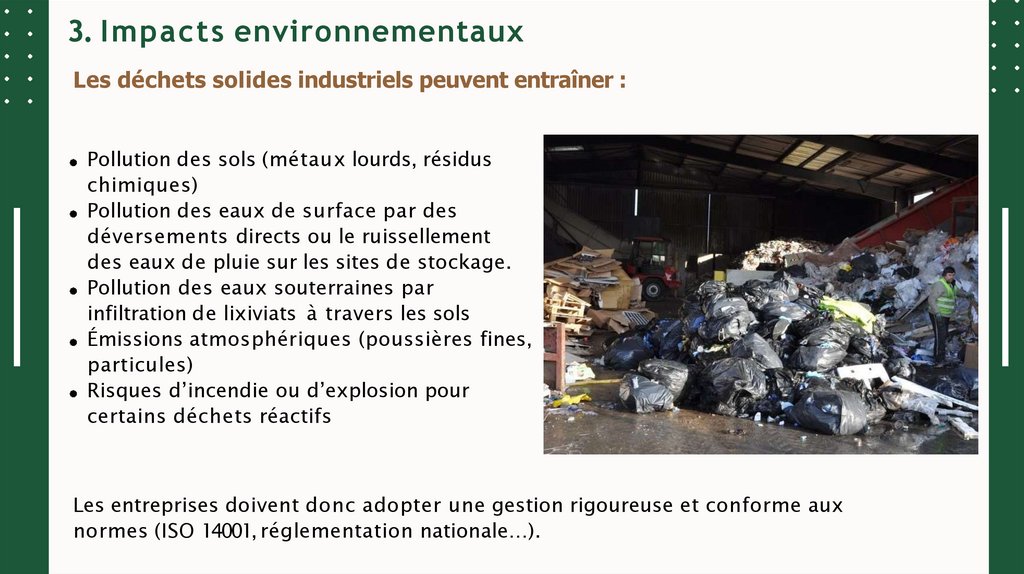 3. Impacts environnementauxLes déchets solides industriels peuvent entraîner :