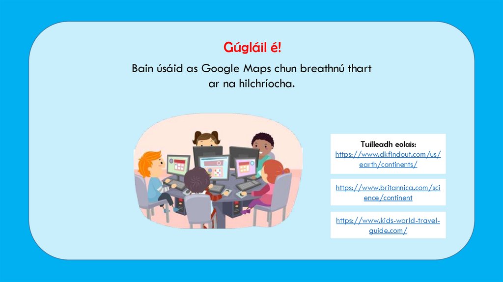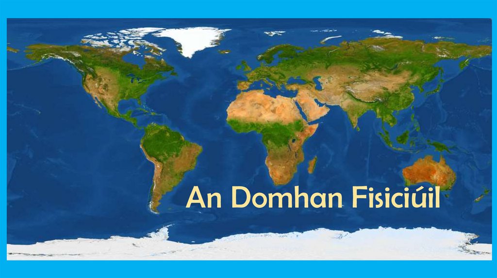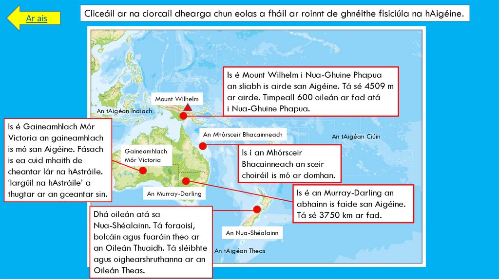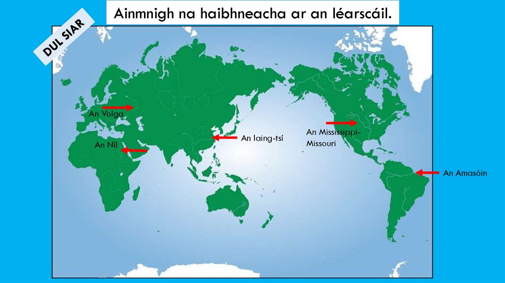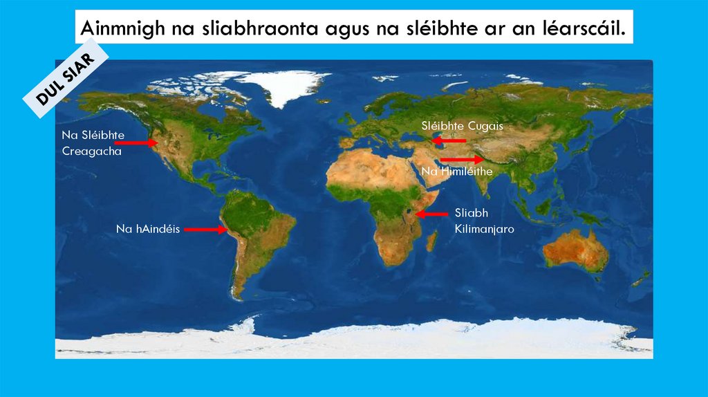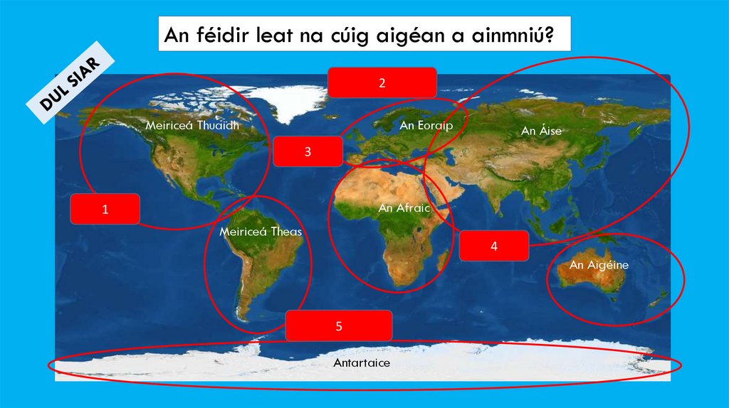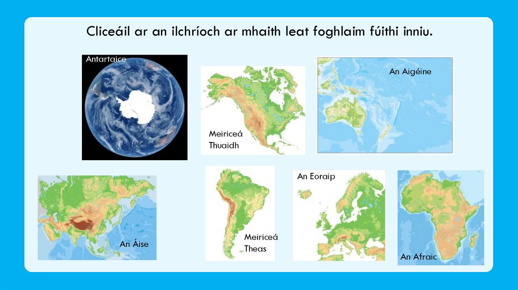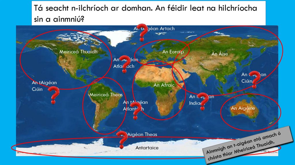 Tá seacht n-ilchríoch ar domhan. An féidir leat na hilchríochaTá cúig aigéan ann. An féidir leat iad a ainmniú?