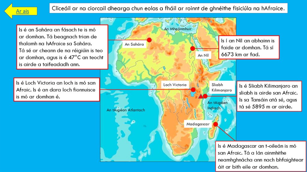 Ar aisCliceáil ar na ciorcail dhearga chun eolas a fháil ar roinnt de ghnéithe fisiciúla na hAfraice.
