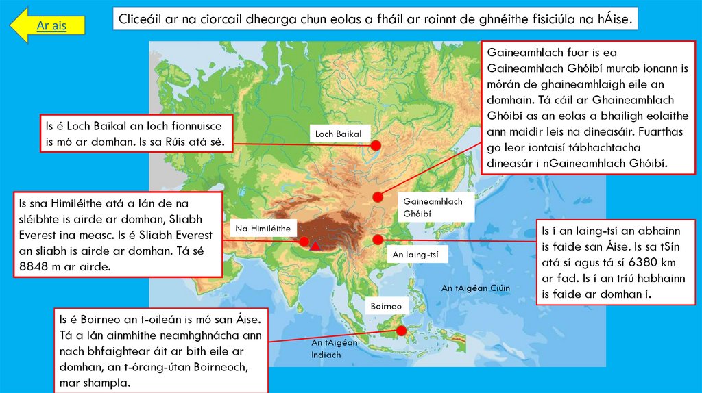 Ar aisCliceáil ar na ciorcail dhearga chun eolas a fháil ar roinnt de ghnéithe fisiciúla na hÁise.