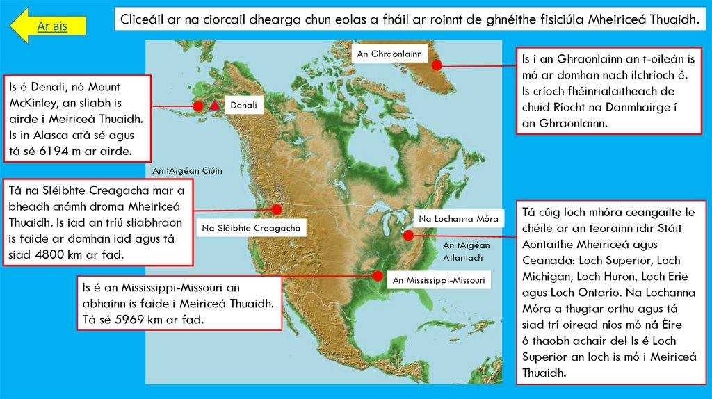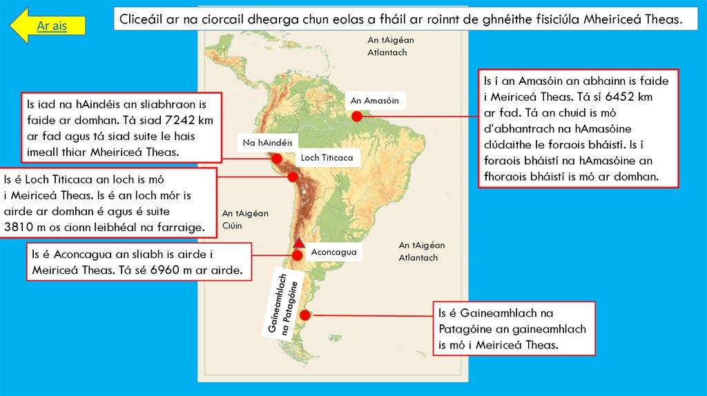 Ar aisCliceáil ar na ciorcail dhearga chun eolas a fháil ar roinnt de ghnéithe fisiciúla Mheiriceá Theas.
